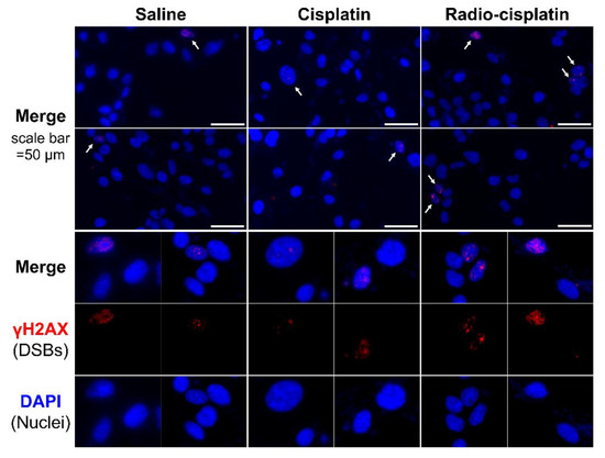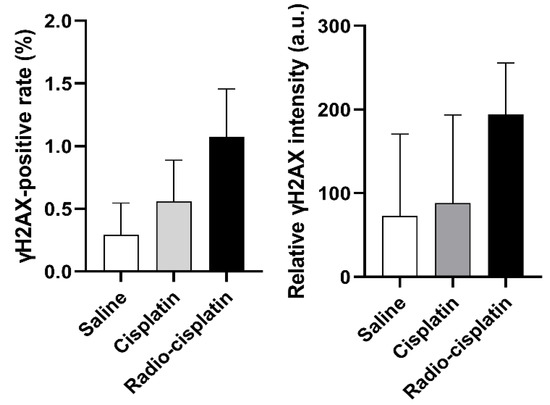 Representative microphotographs of γH2AX staining and its quantitative analysis revealed more γH2AX foci with stronger fluorescence in nuclei treated with n.c.a. radio-cisplatin than in those treated with saline or non-radioactive cisplatin (Figure 3 and Figure 4), indicating that n.c.a. radio-cisplatin induced more DSBs in nuclei. Although the frequency of γH2AX positivity was at most 1% of all nuclei (Figure 4), this is reasonable considering the amount of radio-Pt binding to DNA, as expected from the low DNA binding rate (0.0004% ID) (Table 1). According to this calculation, in 1 × 106 nuclei, 7 × 104 atoms of radio-Pt were expected to decay, while bound to DNA, i.e., the proportion of nuclei with one radio-Pt decay in DNA is 7%. Therefore, this suggests that only a small amount of radio-Pt binding to DNA can induce the formation of DSBs.
