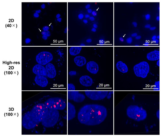 Representative high-resolution 2D and Z-stacked 3D images of cells with strong γH2AX foci (aggregations), observed in samples treated with n.c.a. radio-cisplatin. γH2AX-positive nuclei are indicated by arrows in the upper panels, and high-resolution 2D and 3D images are shown in the middle and lower panels.