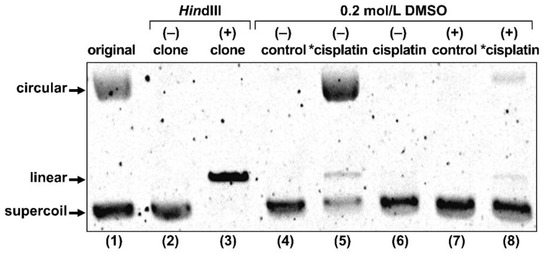 To explore the possibility that Auger e− directly induced the DSBs observed in the γH2AX assay, we conducted gel electrophoresis of plasmid DNA treated with radio-cisplatin (Figure 6). The original plasmid we purchased included circular and supercoiled forms, and the purified plasmid was only supercoiled. The restriction enzyme HindIII cuts one site in the plasmid, yielding the linear form. DMSO was used as an OH-radical scavenger to determine the effect of radicals.