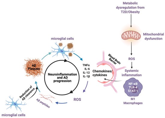 The impact of metabolic disease (T2D and obesity), mitochondrial dysregulation, and the generation of pro-inflammatory cytokines that cross the blood–brain barrier, inducing a cycle of neuroinflammation and increasing the rate of Aβ-plaque generation. Aβ peptides drive the development of ROS, mitochondrial dysfunction, and pro-inflammatory cytokines, which serves to increase AD pathology cyclically. Created by Biorender.com accessed on 30 March 2021.