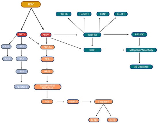 Major markers of the RSV signaling cascade proposed to be beneficial toward brain health. (Blue) SIRT1 inhibition of p53 leads to a reduction in apoptosis, increases in cellular BDNF content; (Orange) SIRT1/AMPK upregulation of PCG1-α expression and activity lead to improvements in biogenesis, preventing ROS accumulation, subsequently leading to reductions in inflammatory markers; (Green) AMPK increases in autophagy-driven Aβ-peptide clearance through mTORC1 inhibition, potential impacts on synaptic plasticity and cognition. Created by Biorender.com accessed on 30 March 2021.