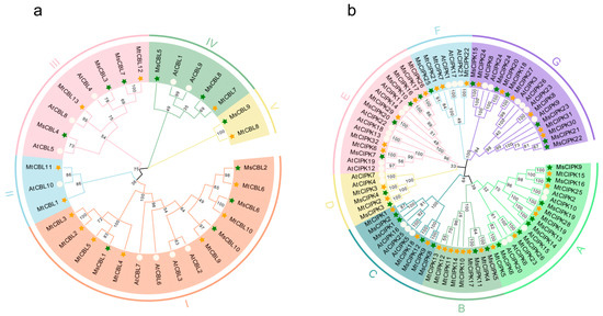 The phylogenetic analysis of CBL (a) and CIPK (b) proteins families across Medicago and Arabidopsis. Full length protein sequences of CBLs and CIPKs were constructed using MEGA-X based on the Neighbor-Joining (NJ) method; bootstrap was 1000 replicates. Subfamilies are highlighted with different colors. The green solid pentagrams, orange solid pentagrams, and hollow circles represent CBL and CIPK proteins from M. sativa (Ms), M. truncatula (Mt), and A. thaliana (At), respectively.