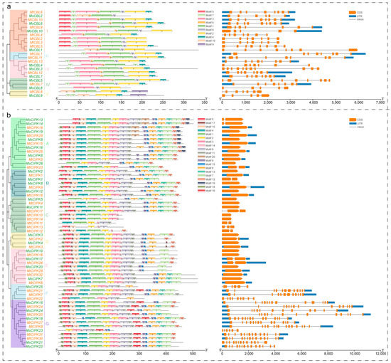 Analyses on phylogenetic relationships, motifs, and gene structure of CBL and CIPK genes from M. sativa and M. truncatula. The groups and its color of the phylogenetic tree are consistent with those in Figure 1. The motifs were indicated in different colored boxes with different numbers and the sequence information for each motif is provided in Figures S1 and S2. Exon–intron structure and conserved domain of CBL and CIPK genes. Blue boxes indicate 5′- and 3′- untranslated regions; orange boxes indicate exons; black lines indicate introns. (a,b) Phylogenetic relationships, motifs, and gene structure of CBL genes (a) and CIPK genes (b).