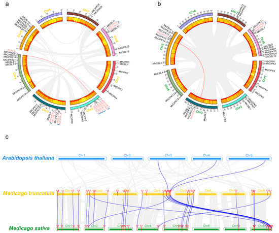 Chromosome distributions of CBLs and CIPKs in M. truncatula and M. sativa. The chromosomal location and interchromosomal relationships of CBL and CIPK genes. The tandem duplicated genes are marked by blue arc trajectory and segmentally duplicated genes are connected by red curves. The chromosomal location and interchromosomal relationships of M. truncatula (a) and M. sativa (b). (c) Synteny analysis of CBL and CIPK genes between M. sativa, M. truncatula and representative plant species (Arabidopsis). Gray lines in the background indicate the collinear blocks within M. truncatula, and M. sativa/Arabidopsis, and the blue lines highlight the syntenic CBL and CIPK gene pairs.