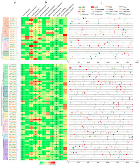 Putative cis-elements and transcription factor binding sites in the promoter regions of CBL and CIPK genes from M. sativa and M. truncatula. (a) The groups and color are indicated as in Figure 1. (b) The colors and numbers of the grid indicated the numbers of different cis-acting elements in these CBL and CIPK genes. (c) The colored block represented different types of cis-acting elements and their locations in each CBL and CIPK gene.