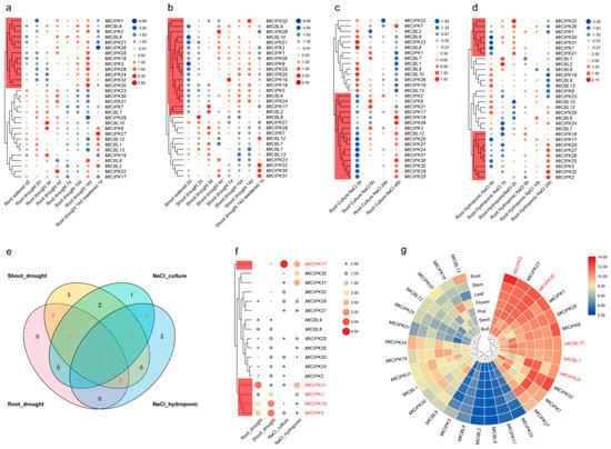 Moreover, Venn diagram, showing the differential expression level of all genes under four different treatments (Figure 5a–d), demonstrated that 17 genes were highly expressed under both drought and NaCl treatment (in red in Figure 5e). In particular, MtCIPK1, 3, 17, 18, 21 showed relatively higher expression level than the other genes under four different treatments (Figure 5f).