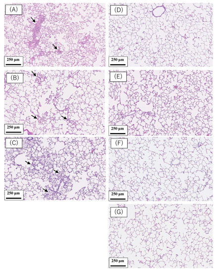 Pathological findings in the rat lung at 6 months after intratracheal instillation of 5 nanomaterials and micron-particles of SiO2. (A) 1 mg NiO-exposed lung. (B) 1 mg CeO2-exposed lung. (C) 1 mg SiO2-exposed lung. (D) 1 mg TiO2 (P90)-exposed lung. (E) 1 mg TiO2 (rutile)-exposed lung. (F) 1 mg ZnO-exposed lung. (G) Negative control in intratracheal instillation (distilled water). Infiltration of inflammatory cells was observed in Figure 1(A–C) (black arrows).