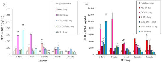 SP-D concentrations in BALF at each time point after intratracheal instillation of nanomaterials: (A) SP-D in low dose of intratracheal instillation, (B) SP-D in high dose of intratracheal instillation. Error bars represent mean ± SD for n = 5/group. Asterisks indicate significant differences compared with each control (Analysis of variance and Dunnett’s test) (* p < 0.05, ** p < 0.01). An average of negative controls in all experiments at each time point showed a single bar of negative control.