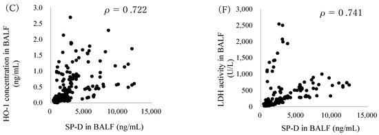 Relationship between SP-D concentration and inflammatory markers in BALF: (A) neutrophils (n = 250), (B) total cell (n = 250), (C) HO-1 (n = 250), (D) CINC-1 (n = 250), (E) CINC-2 (n = 250) and (F) LDH (n = 200) versus SP-D in BALF after intratracheal instillation of nanomaterials. Values of ρ are Spearman’s rank correlation coefficient for all the data.
