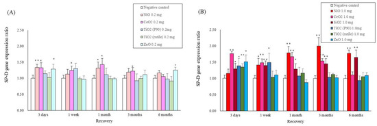 Gene expression of SP-D in lung exposed to nanomaterials with different pulmonary toxicities: (A) SP-D gene expression in low dose of intratracheal instillation, (B) SP-D gene expression in high dose of intratracheal instillation. Error bars represent mean ± SD for n = 5/group. Asterisks indicate significant differences compared with each control (Analysis of variance and Dunnett’s test) (* p < 0.05, ** p < 0.01). An average of negative controls in all experiments at each time point showed a single bar of negative control.