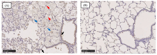 Immunostaining of SP-D in lung at 3 months after exposure. (A) 1 mg NiO-exposed lung. (B) Negative control in intratracheal instillation (distilled water). Positive staining of SP-D was observed in type II alveolar epithelial cells (black arrow), alveolar macrophages (blue arrow) and alveolar mucus (red arrow) in Figure 5A.