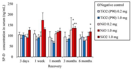 Figure 6 shows the SP-D concentration in the serum at each time point after intratracheal instillation of NiO, TiO2 (P90) and SiO2. Significant increases in the SP-D concentration in serum compared to each negative control were observed in the chronic phase in the groups of high-dose (1.0 mg/rat) exposure to NiO and SiO2, while there was no significant increase in SP-D concentrations in serum in the groups of TiO2 (P90) exposure.
