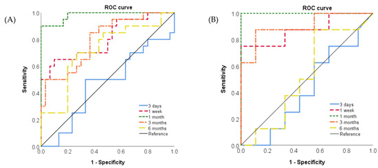 The receiver operating characteristics (ROCs) for the toxicity of nanomaterials by SP-D concentration in BALF and serum. (A) ROC curve of SP-D in BALF (n = 250). (B) ROC curve of SP-D in serum (n = 97).