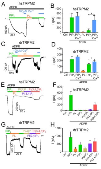 Influence of high calcium and PIP2 derivatives on TRPM2 current restoration. Recordings of HEK-293 cells expressing TRPM2 at −60 mV in the inside-out patch clamp configuration. Currents were activated by cytosolic exposure to ADPR (black bar) and PIP2 (25 µM) (green bar). Representative current trace and statistics of hsTRPM2 (A,B) and drTRPM2 (C,D) at high Ca2+ concentrations (100 µM). High Ca2+ in presence of PIP2 and ADPR (blue bar) causes current restoration after the current was inhibited via 15 µg/mL polylysine (PL, orange bar). Representative recordings and summary of current statistics of the effect of PI derivatives on hsTRPM2 (E,F) and drTRPM2 (G,H) currents using 1 µM cytosolic Ca2+. Statistical analysis was performed via paired Student’s t-test and data presented as mean ± SEM; n = 4–7; * p < 0.05.