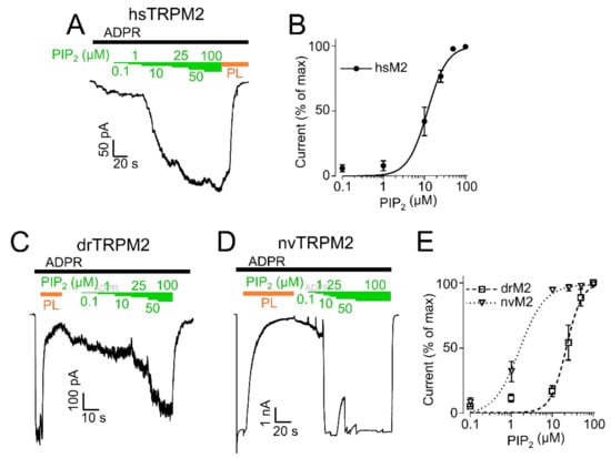 PIP2 sensitivity of TRPM2. PIP2 dose-response recordings of inside-out patches of HEK-293 cells expressing hsTRPM2 (A), drTRPM2 (C), and nvTRPM2 (D). ADPR (black bar) was used to initiate TRPM2 currents followed by increasing concentrations of PIP2 (green bars). Polylysine (PL, orange bar) was utilized to scavenge PIP2. Summary of the PIP2 dose-response recordings calculated as a percentage of the maximum current obtained at 100 µM PIP2 (hsTRPM2 (B), drTRPM2, and nvTRPM2 (E)). Data were analysed from five to six independent experiments.