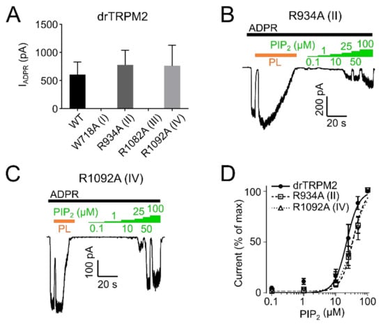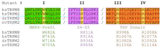 Next, we aimed to identify potential PIP2 interaction sites and their contribution to PIP2-dependent channel regulation. In the cation channel TRPM8, the closest relative of TRPM2, several amino acid residues have been associated with such a role [,,]. Most of them are positively charged and located within the membrane interfacial cavity which in turn is formed by the pre-S1 domain, the junction between S4 and S5, the TRP domain, and MHR4 from the adjacent subunit. In analogy, we chose four residues most critical in TRPM8 and performed a substitution with alanine at corresponding positions of each of the three species variants of TRPM2. Figure 4 specifies the exact position of each of these point mutations which we designate as mutations I to IV for each species for simplicity (e.g., homologous exchange of W743A in hsTRPM2, W718A in drTRPM2 and W705A in nvTRPM2 are all referred to as mutation I).