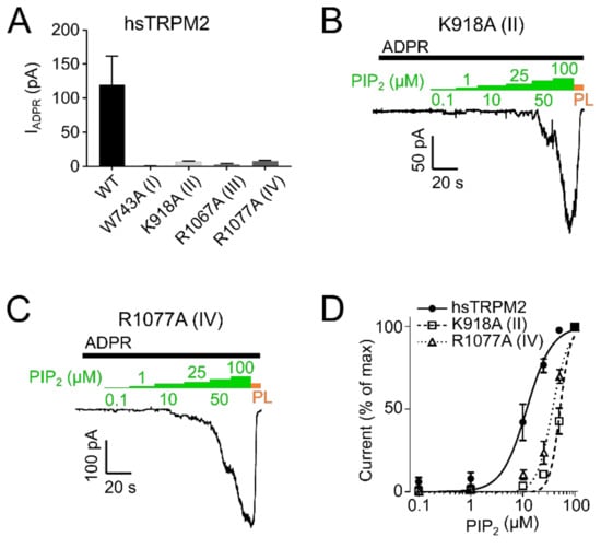 In hsTRPM2 we found that W743A (I) showed a complete absence of ADPR induced currents and was therefore considered non-functional (Figure 5A). Analysis of R1067A (III) showed that ADPR induced either negligible or no response (Figure 5A) and was also unaffected by additional application of up to 100 µM PIP2 (Figure S1B), thereby preventing a quantitative analysis of the PIP2 effects. K918A (II) and R1077A (IV) showed substantial decreases in the current amplitudes (Figure 5A).