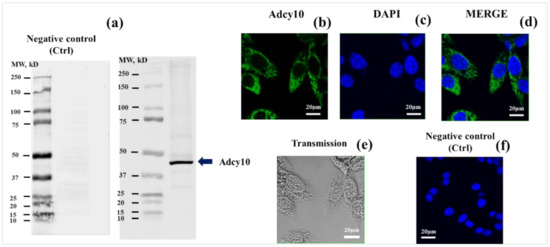 Western blotting for ADCY10 in MLTC-1 cell revealed a band with an apparent molecular mass of 48 kDa (Figure 1a). Immunofluorescence data show the presence of ADCY10 throughout the cytoplasm of MLTC-1 cells (in green) (Figure 1b,d). Figure 1e was processed for TEM (Transmission). Negative control was performed by omitting primary antibodies against ADCY10 (Figure 1f).