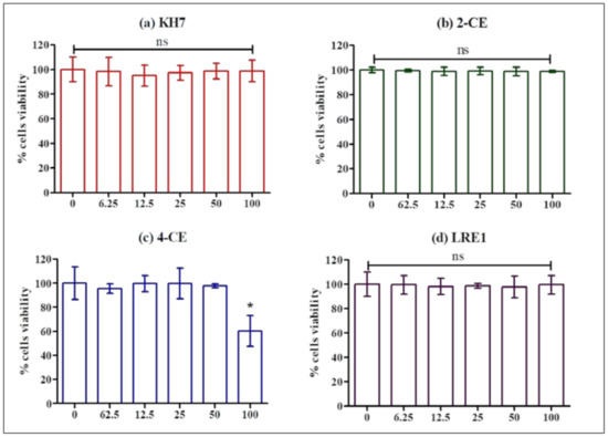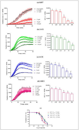 After a 1 h incubation in the presence of KH7, 2-CE, 4-CE or LRE1, following a 2 h preincubation with CellTiter-Glo 2.0 Assay substrate, MLTC-1 cells were found to retain full viability with KH7 (Figure 4a), 2-CE (Figure 4b) and LRE1 (Figure 4d), except at the highest 4-CE concentration (Figure 4c).