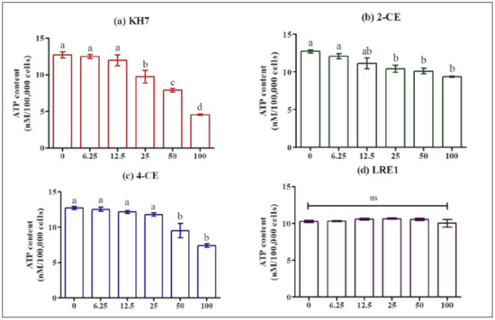 Effect of KH7, 2-CE, 4-CE and LRE1 on the ATP level in MLTC-1 cells. ATP level in MLTC-1 cells was measured after incubation with various concentrations (0, 6.25, 12.5, 50, 100 µM) of KH7 (a), 2-CE (b), 4-CE (c), or LRE1 (d) for 1 h. The experiments were repeated 4 times; values are mean ± SEM. Different letters indicate significant differences between control (0 µM) and treatment at p < 0.05; ns: not statistically significant.