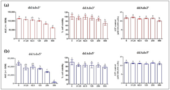 Effect of ddAdo3′ (a) and ddAdo5′ (b) on the intracellular cAMP response to 0.7 nM hLH, on the cell viability and ATP concentration. Cells were treated with various concentrations (0, 31.25, 62.5, 125, 250, 500 µM) of ddAdo3′ or ddAdo5′ for 1 h. The values are means ± SEM for n = 3 independent experiments. p value of <0.05 was considered statistically significant using a one-way ANOVA followed by the Dunnett’s test post-test. Different letters indicate significant differences between control (0 µM) and treatment at p < 0.05.