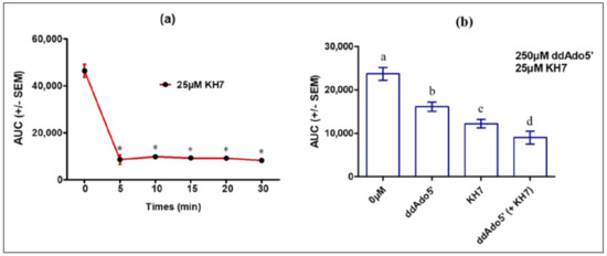 Effects of KH7 and ddAdo5′ on the intracellular cAMP response to 0.7 nM hLH in MLTC-1 cells. (a) Kinetics of KH7 action: MLTC-1 was incubated with 25 µM KH7 for 0–30 min before the addition of hLH and luminescence was recorded for 30 min after hLH introduction; (b) Effects of separate or concomitant actions of KH7 and ddAdo5′. MLTC-1 was incubated with 250 μM ddAdo5′ for 25 min and then exposed to 25 µM KH7 for 5 min. The values are means ± SEM for n = 3 independent experiments. p value of < 0.05 was considered statistically significant using a one-way ANOVA followed by the Dunnett’s test post-test. Different letters or asterisk indicate significant differences between control (0 µM) and treatment at p < 0.05. ns = not statistically significant.