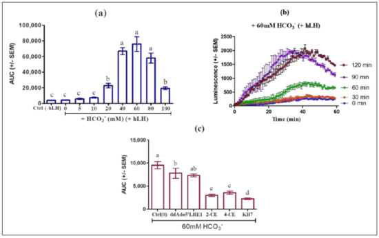 Inhibition of LH/HCO3− stimulation of MLTC-1 cells by soluble adenylyl cyclases (ADCY10) inhibitors KH7, 2-CE, 4-CE and LRE1. (a) Dose-dependent effect of HCO3− on the LH-stimulated intracellular cAMP accumulation in MLTC-1. The cells were preincubated for 60 min in HEPES buffer solution in the presence of different HCO3− concentrations before stimulation by 0.7 nM hLH and Control (Ctrl) (absence of HCO3− and hLH). (b) Kinetics of LH-stimulated intracellular cAMP accumulation after a 0 to 120 min preincubation in HEPES buffer solution in the presence of 60 mM HCO3−. (c) Effects of different ADCY10 inhibitors on the LH-stimulated intracellular cAMP accumulation in MLTC-1. The cells were preincubated in HEPES buffer solution with 60 mM HCO3− for 90 min and then exposed to KH7 (50 µM), 2-CE (100 µM), 4-CE (100 µM) or LRE1 (100 µM) or ddAdo5’ (250 µM) for 30 min, before stimulation by 0.7 nM hLH. The values in all experiments are means ± SEM for n = 3 independent experiments. p value of <0.05 was considered statistically significant using a one-way ANOVA followed by the Dunnett’s test post-test. Different letters indicate significant differences between control (0 µM) and each treatment at p < 0.05.
