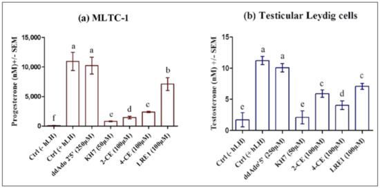 Effect of KH7, 2-CE, 4-CE, LRE1, or ddAdo5′, on 0.7 nM hLH-promoted steroid production in MLTC-1 and primary Leydig cells. (a) MLTC-1 cells or (b) Testicular Leydig cells were preincubated with or without KH7, 2-CE, 4-CE, LRE1, or ddAdo5′, at the indicated concentrations for 1 h and then the cells were stimulated for 3 hours with 0.7 nM hLH before progesterone (a) or testosterone (b) productions were measured. Data are means ± SEM of 3 independent experiments performed in duplicate. p value of <0.05 was considered statistically significant using a one-way ANOVA followed by the Dunnett’s test post-test. Different letters indicate significant differences between control (0 µM) and each treatment at p < 0.05.