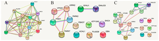 Figure 1. STRING analysis of connections between (human) genes in Table 1. Panel (A): using by default settings. Panel (B). Restricted settings (mainly leaving aside connections driven by PD-related literature; see text for details). Panel (C): Interaction-enriched connection pattern (see text for details). Line color code: sky blue, known interactions from curated databases; magenta, experimentally determined interactions; green, predicted from neighborhood; red, predicted from gene fusions; blue, predicted from gene co-occurrence; pastel green, textmining; black, coexpression; and clear violet, protein homology.