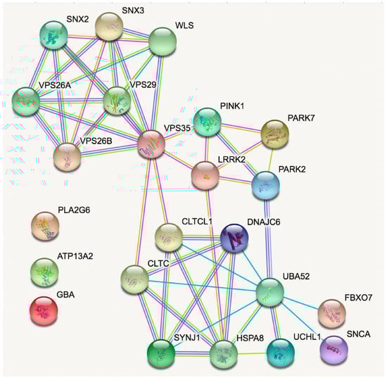 STRING is a powerful tool as it permits the enrichment of networks but avoiding the bias of parkinsonism in the enrichment. In doing so, the PARK2/PARK7/PINK1/LRRK2/VPS35 network connects with the SYNJ1/DNAJC6 network. Obviously, this only is possible if more genes, related or not with PD, are considered. The resulting enriched network is in Figure 2.