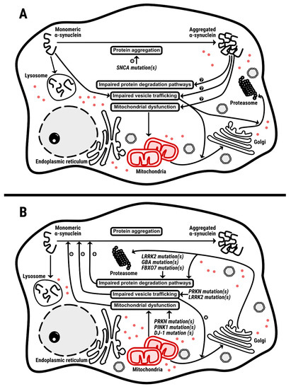 Figure 3. Mechanisms of dyshomeostasis of dopaminergic neurons. Panel (A). Mutations in SNCA leads to aggregation of mutated α-synuclein that affects the mechanisms of protein handling and vesicle transport, thus dysbalancing mitochondrial dynamics and function. Panel (B). Mutations in genes that affect protein processing, vesicle transport and mitochondrial function leads to aggregation of non-mutated α-synuclein. Red dots represent ATP molecules, mainly synthesized in the mitochondria of neurons, that are needed for all the processes depicted in the schemes.