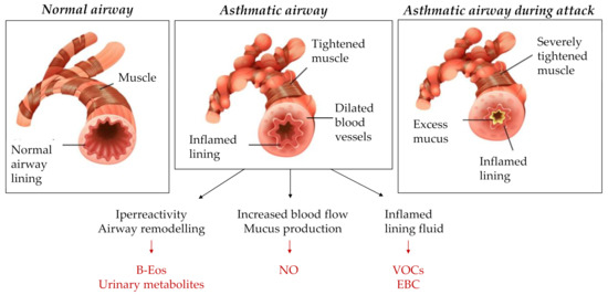 Biomarkers as indicators of pathological modification in asthmatic airways. Abbreviations: B-Eos = blood eosinophils; NO = nitric oxide; VOCs = volatile organic compounds; EBC = exhaled breath condensate. Image in collaboration with: Freepik.com.