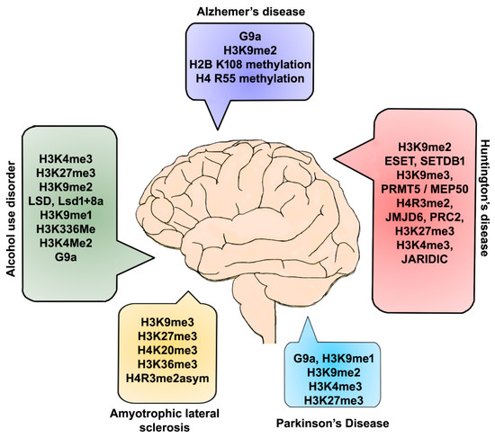 HD is a late-onset, autosomal progressive neurodegenerative disorder caused by the trinucleotide CAG repeat in the coding for glutamine (Q) in exon 1 of the Huntingtin (Htt) gene [105], leading to the motor, cognitive and psychiatric symptomatology [106,107]. Modification of the chromatin structure and deregulation of neuronal gene transcription are prominent features associated with the earliest stage of HD. Studies in recent decades using patients and multiple animal models of HD have identified histone modifications (acetylation, methylation, ubiquitylation, and phosphorylation) (see review [108]) and DNA modifications as significant epigenetic modifications that regulate gene expression in HD. The pharmacological approaches directed to correct some of those epigenetic changes have offered potential in treating HD (see review [109]). The following discussion presents the most recent advances in histone methylation-mediated epigenetics for potential HD disease interventions.