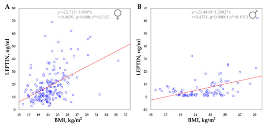 Correlation between serum leptin concentrations and BMI in the Yakut population. (A) Females. (B) Males.