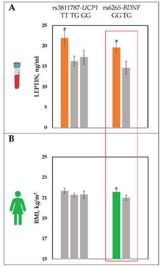 The leptin levels and BMI divided by the rs3811787 (UCP1) and the rs6265 (BDNF) genotypes. (A) Comparison of leptin levels by the rs3811787 (UCP1) and rs6265 (BDNF) genotypes for the group of females with normal BMI (n = 215). (B) Comparison of BMI by the rs3811787 (UCP1) and rs6265 (BDNF) genotypes for the group of females with normal BMI (n = 215). The data shown are mean ± SE. * p ≤ 0.05.