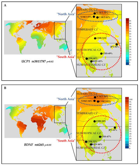 - The rs3811787 (UCP1) and rs6265 (BDNF) were studied for possible indicators of natural selection towards cold climate adaptation. Among eight East Asian populations, the high prevalence of the T-allele of rs3811787 (UCP1) and the G-allele of rs6265 (BDNF) was found in populations living in subarctic and temperate climatic zones, in comparison with populations from subtropical and subequatorial climate (p < 0.05).