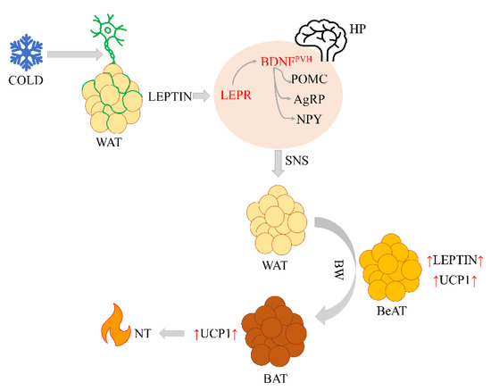 Possible mechanism of leptin-dependent neuro-fatty regulation of nonshivering thermogenesis. Note: WAT—white adipose tissue, LEPR—leptin receptor, BDNFPVH—BDNF neuron, AgRP—agouti-related peptide neuron, NPY—neuropeptide Y, POMC—proopiomelanocortin, HP—the hypothalamus, SNS—sympathetic nervous system, BW—browning, BeAT—beige adipose tissue, BAT—brown adipose tissue, NT—nonshivering thermogenesis, red up-arrows—increased levels of leptin or UCP1.