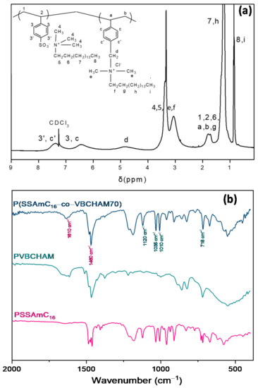 (a) The 1H-NMR and (b) ATR-FTIR spectra of the copolymer P(SSAmC16-co-VBCHAM70).