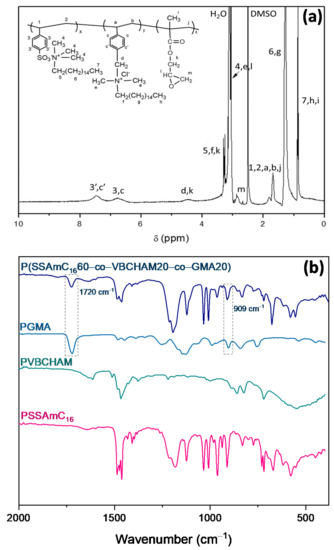 The synthesis of the terpolymer P(SSAmC1660-co-VBCHAM20-co-GMA20) was verified through the 1H-NMR spectra, shown in Figure 2a. The protons from the main chain of the copolymer (1, 2, a, b, j) were observed in the range of 1.6–1.8 ppm, while the peaks at 6.5–7.5 ppm corresponded to the protons of the aromatic rings (3, 3 ‘, c, c’). The protons of the methyl groups attached to the nitrogen atoms (4, e) appeared at 3.3 ppm, while the protons of the final methyl groups of the amines (7, h), as well as the methylene group (i), appeared at 0.8 ppm. Finally, methylene groups (5, f) and (6, g) were observed at 3.2 and 1.3 ppm, respectively. Except for the characteristic peaks of the SSAmC16 and VBCHAM moieties that were described above, characteristic peaks of GMA were also observed in the spectra.