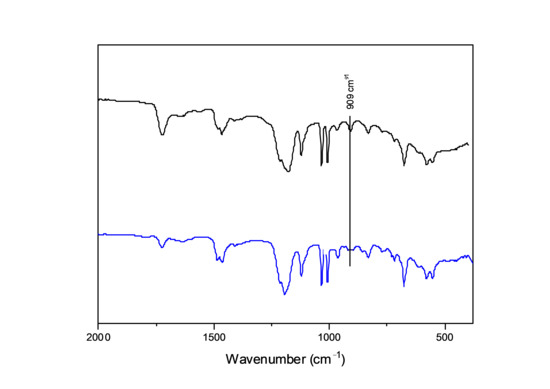 The success of the cross-linking reaction was observed through ATR-FTIR characterization of the synthesized membranes. Figure 3 presents the spectra of the film created between P(SSAmC1660-co-VBCHAM20-co-GMA20) and PAA before and after cross-linking at 120 °C. The characteristic peaks that were examined in order to verify the cross-linking reaction were the peak at 1720 cm−1, which corresponded to the carbonyl stretch of C=O group, and the peak at 909 cm−1, which was a representative peak of the epoxy group. As observed in the spectra of the cross-linked film, the peak at 909 cm−1 diminished to a great extent, showing the ring opening of GMA and, therefore, the reaction between epoxy and carboxyl groups.