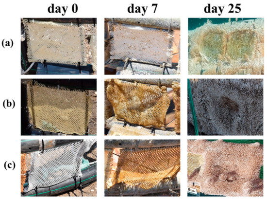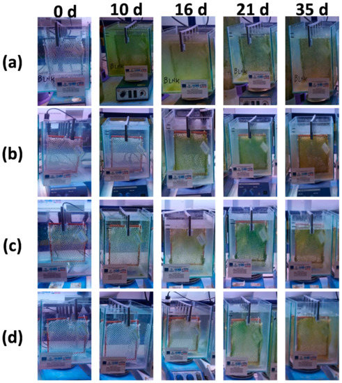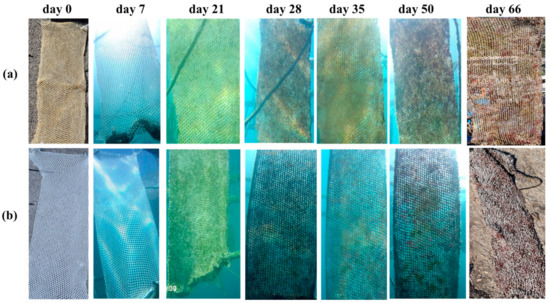 The immersed nets were optically observed periodically during the experimental procedure, and photographs at 0, 10, 16, 21, and 35 days are shown in Figure 4.