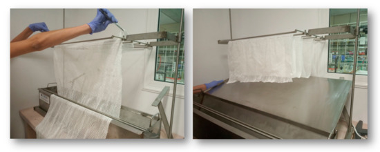 For the pilot-scale coating of antimicrobial polymers on the aquaculture nets, the homemade bath was used, equipped with a drying system (Figure 7), as described in the Experimental section.