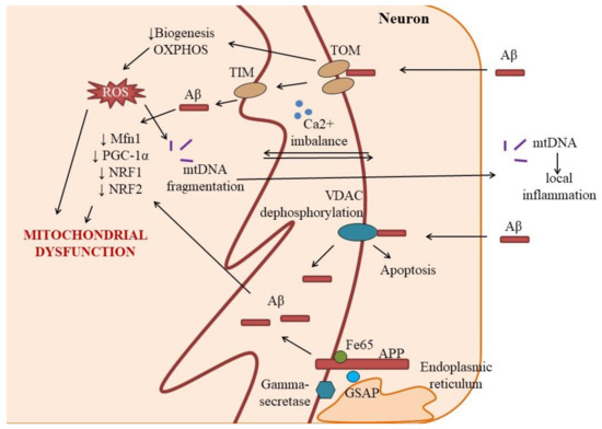 Considering that mitochondria control many cellular events like the final stages of catabolism leading to production of ATP, cell viability and its sensitivity to the action of factors that induce apoptosis, necrosis and autophagy, maintaining ion homeostasis, signal transduction, any mitochondrial damage in Alzheimer’s disease has significant consequences for neurons. Therefore, it is not surprising that damage to the mitochondria of neurons in Alzheimer’s type neurodegeneration is considered as an integral mechanism of the disease progression: toxic action of Aβ, Ca2+ imbalance and overproduction of reactive oxygen species have been reported as the main causes and outcomes of mitochondrial dysfunction [19,20] being closely associated with energy deficit in neurons due to glucose hypometabolism and development of local insulin resistance [21]. Aβ-induced deregulation of local Ca2+ signaling due to mitochondrial dysfunction results in ROS overproduction in mitochondria, development of oxidative stress, and progression of cell death (apoptosis or autophagy) [22,23].