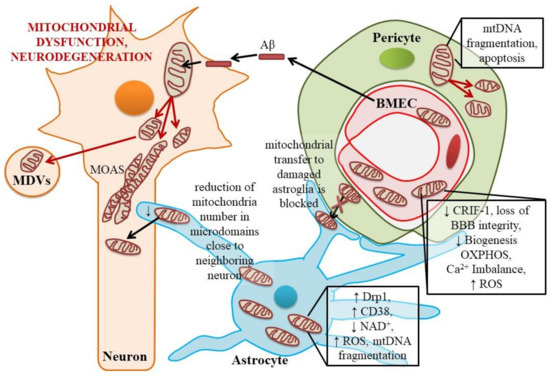 Impaired mitochondrial function in Alzheimer’s disease within neurovascular unit. MDVs—mitochondria-derived vesicles; MOAS—mitochondria-on-a-string; mtDNA—mitochondrial DNA; Aβ—amylod beta; BMEC—brain microvessel endothelial cells; Drp1—dynamin-related protein 1; CD38—cluster of differentiation 38; ROS—reactive oxygen species; CRIF-1—CR6-interacting factor 1; BBB—blood–brain barrier; OXPHOS—oxidative phosphorylation.