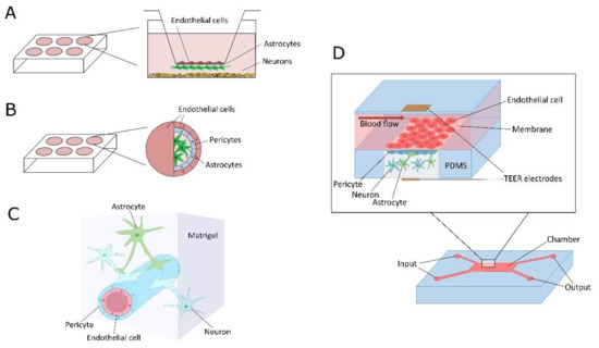 Blood–brain barrier in vitro models. (A)—2D static transwell model; (B)—3D static model; (C)—3D microdynamic/microfluidic/microvessel-on chip model; (D)—3D multicellular ensembles established from various components of the BBB. PDMS—Polydimethylsiloxane (polymeric organosilicon compounds); TEER—trans-endothelial electrical resistance.