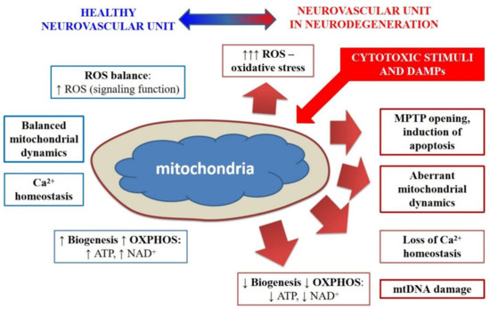 Mitochondria-driven pathways in the blood–brain barrier in healthy brain and neurodegeneration. Blue indicates physiological events, changes during neurodegeneration are indicated in red. ROS—reactive oxygen species; MPTP—mitochondrial permeability transition pore; mtDNA—mitochondrial DNA; OXPHOS—oxidative phosphorylation; NAD—nicotinamide adenine dinucleotide; ATP—adenosine triphosphate.