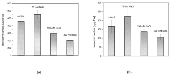 Salinity stress induced by 75, 150, and 220 mM NaCl had no clear negative influence on the content of photosynthetic pigments in A. thaliana rosette leaves (Figure 2). Carotenoid (Car) and chlorophyll (Chl) content in the salt-treated plants did not reveal significant differences as compared to the controls.