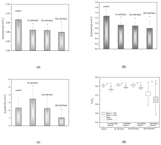 Stomatal conductance (a), transpiration rate (b), and the net CO2 assimilation rate (c) measured three days after inducing salt stress in 4-week old A. thaliana rosettes. Maximal PSII efficiency (FV/FM) in A. thaliana plants exposed to salinity under LL (empty box charts) and an acute HL (pattern-filled box charts) is shown in (d). Results are presented as box-and-whisker plots, showing mean, standard error, and outliers at the 95% confidence level. An asterisk (*) indicates significant differences (p ≤ 0.05, the Mann-Whitney U test) between control and salt-treated plants (a–c), and plants before (LL) and after an acute HL treatment (d).