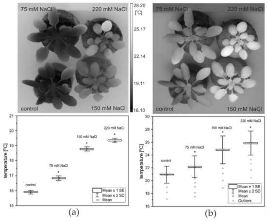 Infrared thermography (IR thermography) has been widely used in many fields of science and technology, including agriculture, horticulture, and plant physiology, as a non-destructive method for the detection of heat transfer, heat loss, hot spots, and temperature distribution [1,2,3,4,5]. Thermography is appropriate for studies of the effects of temperature on plants and has distinct advantages for the quantitative analysis of spatial and dynamic physiological information [1]. Leaf temperature varies with transpiration rate [6], which is largely a function of stomatal conductance and water vapour deficit. In well-watered plants, transpiration represents one of the most effective means of cooling because the specific heat capacity of water is higher than that of any other common substances [7,8]. Opening of the stomata results in evaporative cooling and a decrease in leaf temperature. The internal metabolic processes of plant tissues, as well as radiation absorption, can increase leaf temperature, whereas the latent heat of evaporation, heat conduction, and heat convection work to counteract such heating [9]. Thermal imaging has already been used for measuring stomatal conductance [10,11], detecting water stress [12,13], diseases and infections in plants [14,15,16], frost-sensitive species [17], mutations [18,19], and thermogenesis [20]. This technique has been used for screening salt tolerance in plants [21,22,23] and also for diagnosing the effects of salinity in a soilless culture [24], which caused a reduction in water content in plant tissues and stomata conductance.