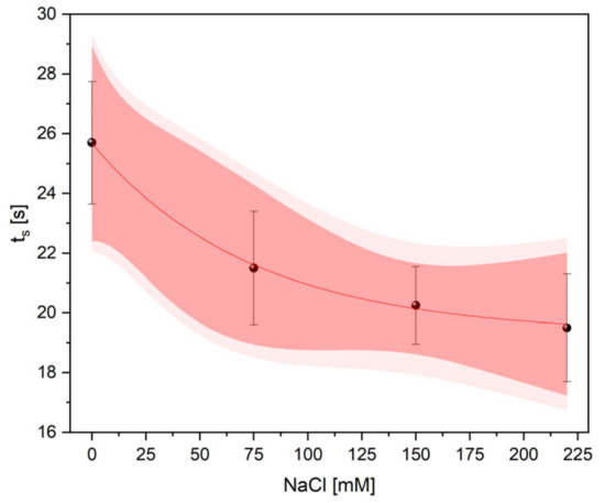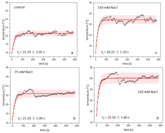The experimental data, which show temperature changes over time, were fitted using a mono-exponential function y = y0 + ys·[1 − exp(−t/ts)], where y0 and ys is an amplitude and ts represents the thermal time constant. The bands (Figure 5a–d) represent 95% confidence (dark red) and prediction (light red) intervals. Analysis of thermal rise times revealed that ts decreased with increasing NaCl concentration (control: ts = 25.70 ± 2.05 s; 75 mM NaCl: ts = 21.50 ± 1.90 s; 150 mM NaCl: ts = 20.25 ± 1.30 s and 220 mM NaCl: ts = 19.50 ± 1.80 s). The values of ts, which were determined for non- and salt-treated plants under HL, are presented in (Figure 6) and show an exponential decay. In the case of the highest NaCl concentration (220 mM), the thermal time constant was reduced by almost 25% as compared to the controls.